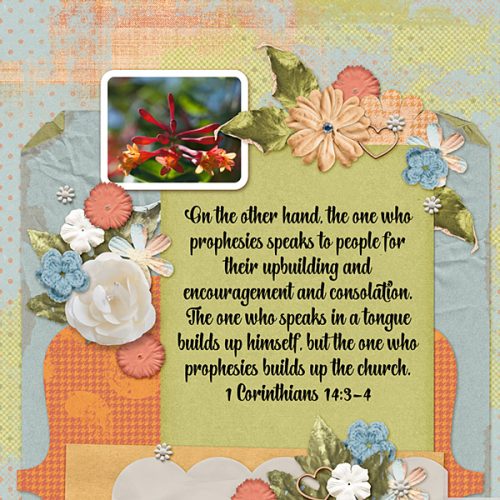 For those who are unfamiliar with scrapbooking, the pages made are called “layouts.” The digital scrapbook “world” has a regular practice where they choose a “layout of the day” to feature (which is an honor). The name of this page is “Layout for Today” because there is one per day (but the words “of the” [day] were intentionally not used, because the point is to bring honor and glory to God, not to any person).