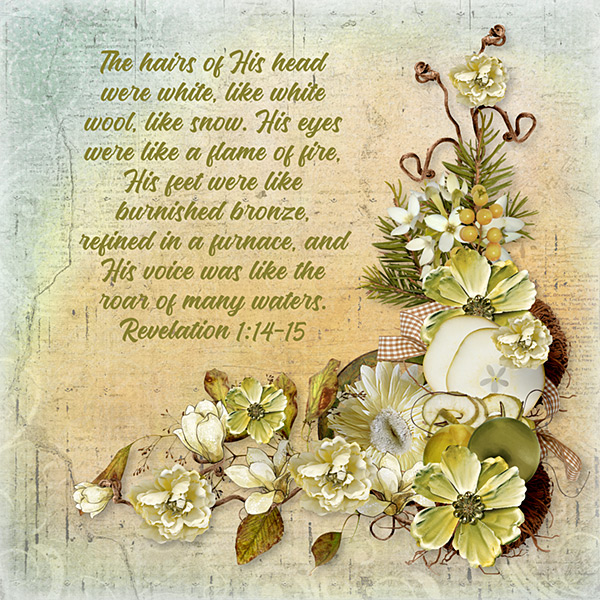 The hairs of His head were white, like white wool, like snow. His eyes were like a flame of fire, His feet were like burnished bronze, refined in a furnace, and His voice was like the roar of many waters. Revelation 1:14-15