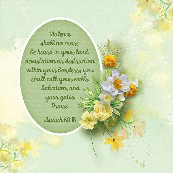 Violence shall no more be heard in your land, devastation or destruction within your borders; you shall call your walls Salvation, and your gates Praise. Isaiah 60:18