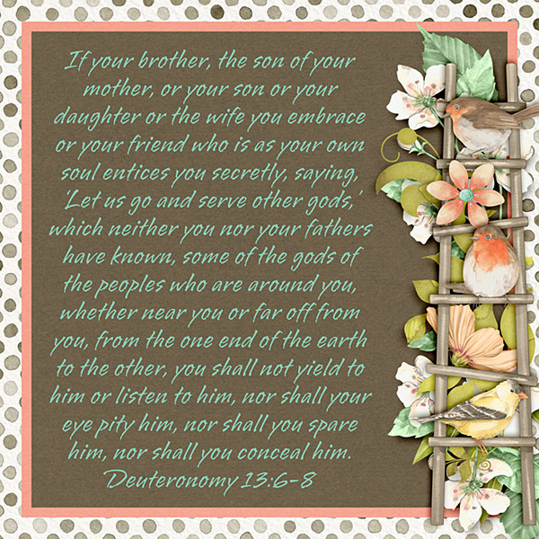 If your brother, the son of your mother, or your son or your daughter or the wife you embrace or your friend who is as your own soul entices you secretly, saying, ‘Let us go and serve other gods,’ which neither you nor your fathers have known, some of the gods of the peoples who are around you, whether near you or far off from you, from the one end of the earth to the other, you shall not yield to him or listen to him, nor shall your eye pity him, nor shall you spare him, nor shall you conceal him. Deuteronomy 13:6-8