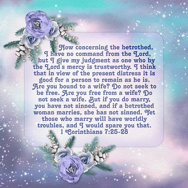 Now concerning the betrothed, I have no command from the Lord, but I give my judgment as one who by the Lord’s mercy is trustworthy. I think that in view of the present distress it is good for a person to remain as he is. Are you bound to a wife? Do not seek to be free. Are you free from a wife? Do not seek a wife. But if you do marry, you have not sinned, and if a betrothed woman marries, she has not sinned. Yet those who marry will have worldly troubles, and I would spare you that. 1 Corinthians 7:25-28