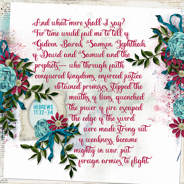And what more shall I say? For time would fail me to tell of Gideon, Barak, Samson, Jephthah, of David and Samuel and the prophets— who through faith conquered kingdoms, enforced justice, obtained promises, stopped the mouths of lions, quenched the power of fire, escaped the edge of the sword, were made strong out of weakness, became mighty in war, put foreign armies to flight. Hebrews 11:32-34