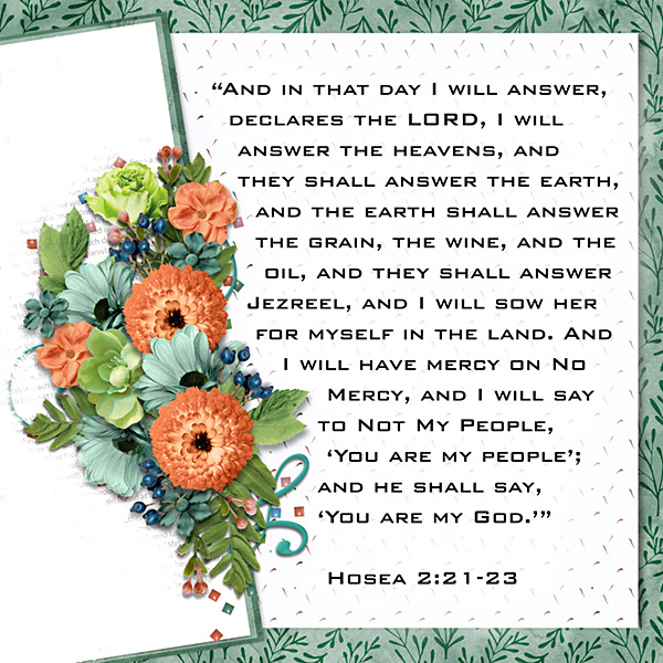 “And in that day I will answer, declares the LORD, I will answer the heavens, and they shall answer the earth, and the earth shall answer the grain, the wine, and the oil, and they shall answer Jezreel, and I will sow her for myself in the land. And I will have mercy on No Mercy, and I will say to Not My People, ‘You are my people’; and he shall say, ‘You are my God.’” Hosea 2:21-23