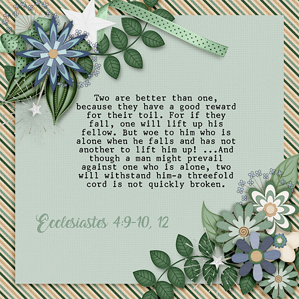 Two are better than one, because they have a good reward for their toil. For if they fall, one will lift up his fellow. But woe to him who is alone when he falls and has not another to lift him up! …And though a man might prevail against one who is alone, two will withstand him—a threefold cord is not quickly broken. Ecclesiastes 4:9-10, 12