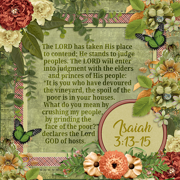 The LORD has taken His place to contend; He stands to judge peoples. The LORD will enter into judgment with the elders and princes of His people: “It is you who have devoured the vineyard, the spoil of the poor is in your houses. What do you mean by crushing my people, by grinding the face of the poor?” declares the Lord GOD of hosts. Isaiah 3:13-15