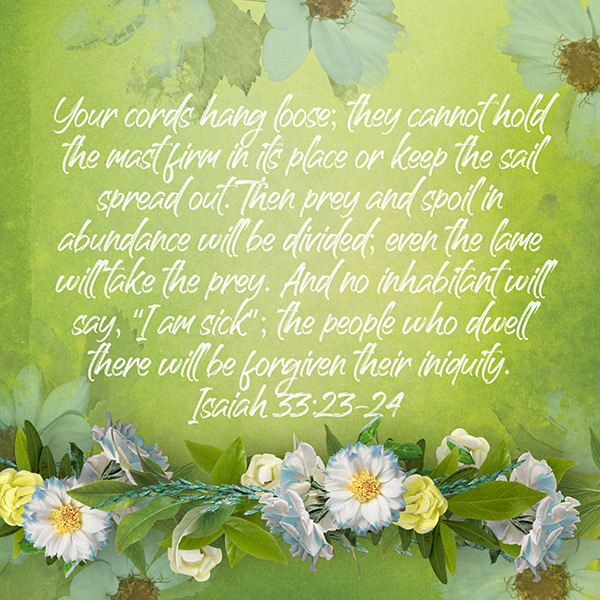 Your cords hang loose; they cannot hold the mast firm in its place or keep the sail spread out. Then prey and spoil in abundance will be divided; even the lame will take the prey. And no inhabitant will say, “I am sick”; the people who dwell there will be forgiven their iniquity. Isaiah 33:23-24