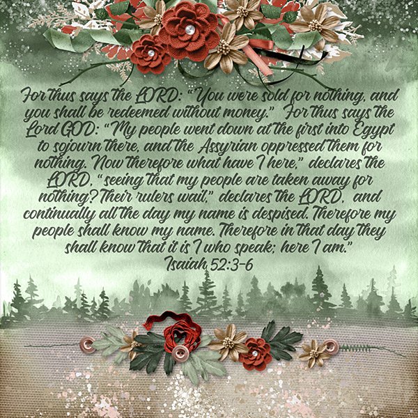For thus says the LORD: “You were sold for nothing, and you shall be redeemed without money.” For thus says the Lord GOD: “My people went down at the first into Egypt to sojourn there, and the Assyrian oppressed them for nothing. Now therefore what have I here,” declares the LORD, “seeing that my people are taken away for nothing? Their rulers wail,” declares the LORD, “and continually all the day my name is despised. Therefore my people shall know my name. Therefore in that day they shall know that it is I who speak; here I am.” Isaiah 52:3-6
