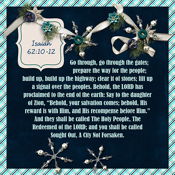 Go through, go through the gates; prepare the way for the people; build up, build up the highway; clear it of stones; lift up a signal over the peoples. Behold, the LORD has proclaimed to the end of the earth: Say to the daughter of Zion, “Behold, your salvation comes; behold, His reward is with Him, and His recompense before Him.” And they shall be called The Holy People, The Redeemed of the LORD; and you shall be called Sought Out, A City Not Forsaken. Isaiah 62:10-12