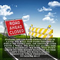 Please let us pass through your land. We will not pass through field or vineyard, or drink water from a...